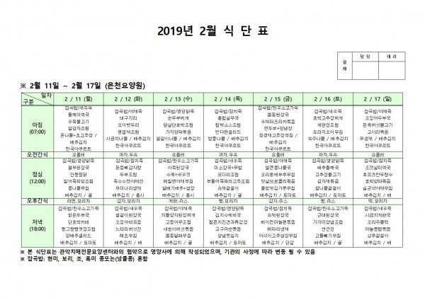 2월 둘째주 식단표 페이지 정보 작성자 은천노인복지회 작성일19-02-13 17:30 조회199,244회 댓글0건 관련링크 이전글 다음글 목록 답변 본문 2월 둘째주 식단표 이전글 다음글 목록 답변
