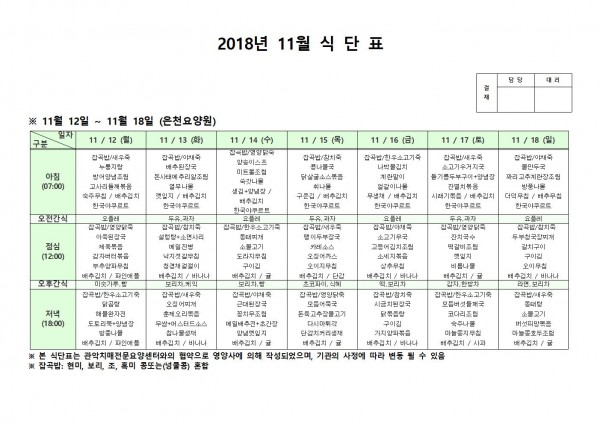 11월 2주째 식단표 페이지 정보 작성자 은천노인복지회 작성일18-12-07 09:37 조회199,428회 댓글0건 관련링크 이전글 다음글 목록 답변 본문 11월 2주째 식단표 이전글 다음글 목록 답변