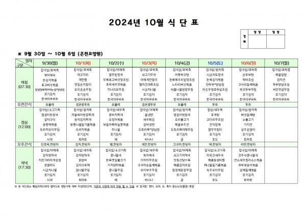 10월 첫째주 식단표 페이지 정보 작성자 은천노인복지회 작성일24-09-27 17:45 조회14,371회 댓글0건 관련링크 이전글 다음글 목록 답변 본문 . 이전글 다음글 목록 답변
