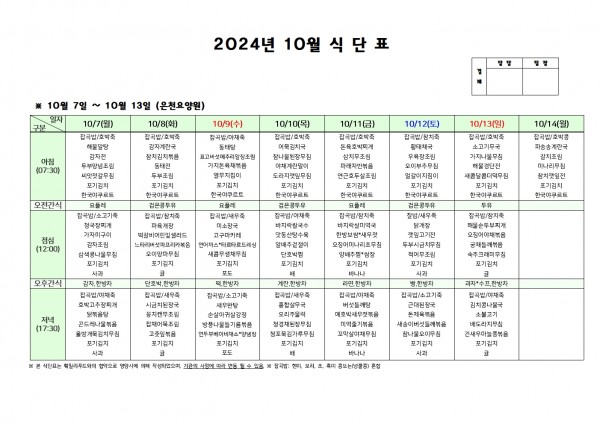 10월 둘째주 식단표 페이지 정보 작성자 은천노인복지회 작성일24-10-04 11:48 조회14,434회 댓글0건 관련링크 이전글 다음글 목록 답변 본문 . 이전글 다음글 목록 답변