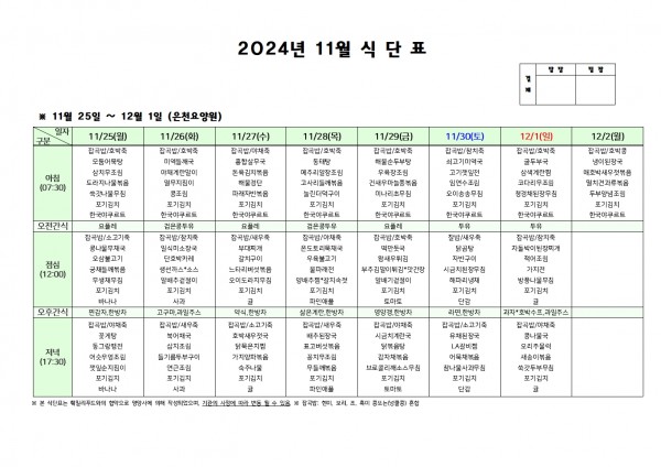 11월 넷째주 식단표 페이지 정보 작성자 은천노인복지회 작성일24-11-22 09:32 조회13,186회 댓글0건 관련링크 이전글 다음글 목록 답변 본문 . 이전글 다음글 목록 답변