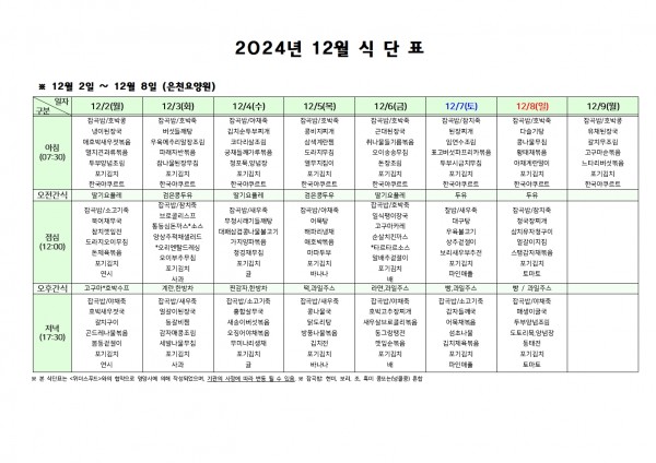 12월 첫째주 식단표 페이지 정보 작성자 은천노인복지회 작성일24-11-29 16:53 조회12,852회 댓글0건 관련링크 이전글 다음글 목록 답변 본문 . 이전글 다음글 목록 답변