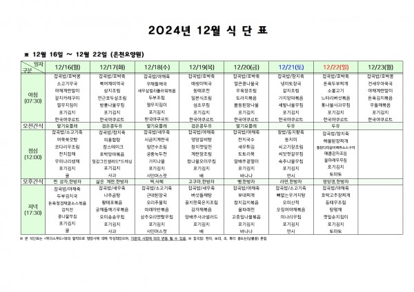12월 셋째주 식단표 페이지 정보 작성자 은천노인복지회 작성일24-12-13 09:36 조회12,053회 댓글0건 관련링크 이전글 다음글 목록 답변 본문 . 이전글 다음글 목록 답변