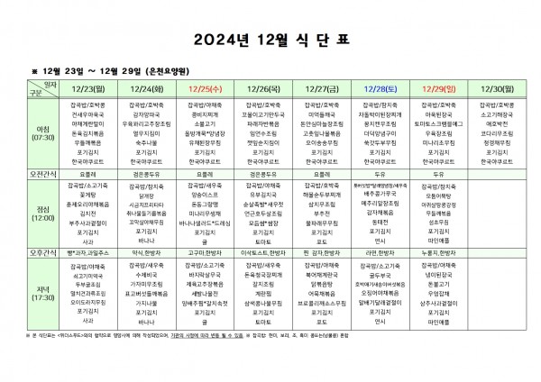 12월 넷째주 식단표 페이지 정보 작성자 은천노인복지회 작성일24-12-23 16:39 조회11,315회 댓글0건 관련링크 이전글 다음글 목록 답변 본문 . 이전글 다음글 목록 답변
