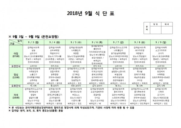 9월 첫째주 식단표 페이지 정보 작성자 은천노인복지회 작성일18-09-11 09:27 조회198,676회 댓글0건 관련링크 이전글 다음글 목록 답변 본문 9월 첫째주 식단표 이전글 다음글 목록 답변