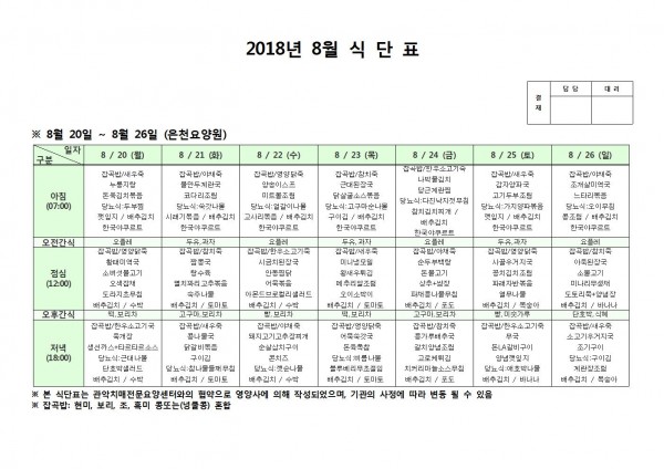8월 넷째주 식단표 페이지 정보 작성자 은천노인복지회 작성일18-08-27 14:01 조회199,651회 댓글0건 관련링크 이전글 다음글 목록 답변 본문 8월 넷째주 식단표다 이전글 다음글 목록 답변