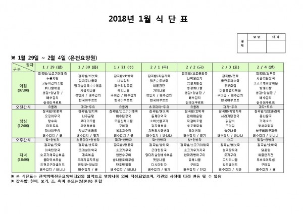 1월 다섯째주 식단표 페이지 정보 작성자 은천노인복지회 작성일18-01-31 13:35 조회187,321회 댓글0건 관련링크 이전글 다음글 목록 답변 본문 1월 다섯째주 식단표 이전글 다음글 목록 답변
