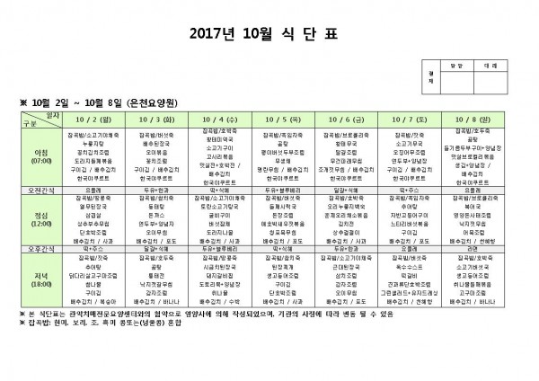 10월 첫째주 식단표 페이지 정보 작성자 은천노인복지회 작성일17-10-11 10:52 조회176,572회 댓글0건 관련링크 이전글 다음글 목록 답변 본문 10월 첫째주 식단표 이전글 다음글 목록 답변
