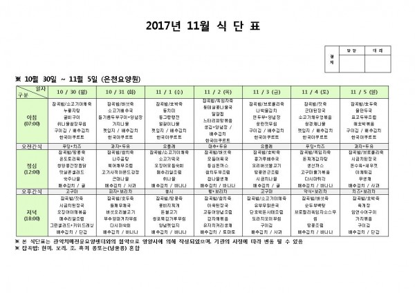 11월 첫째주 식단표 페이지 정보 작성자 은천노인복지회 작성일17-11-09 10:43 조회178,844회 댓글0건 관련링크 이전글 다음글 목록 답변 본문 11월 첫째주 식단표 이전글 다음글 목록 답변