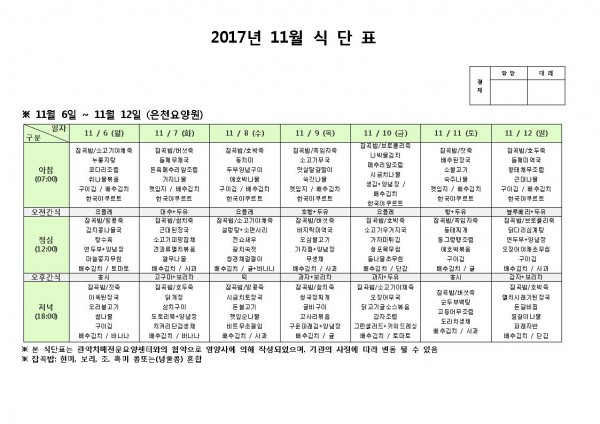 11월 둘째주 식단표 페이지 정보 작성자 은천노인복지회 작성일17-11-09 10:44 조회178,655회 댓글0건 관련링크 이전글 다음글 목록 답변 본문 11월 둘째주 식단표 이전글 다음글 목록 답변