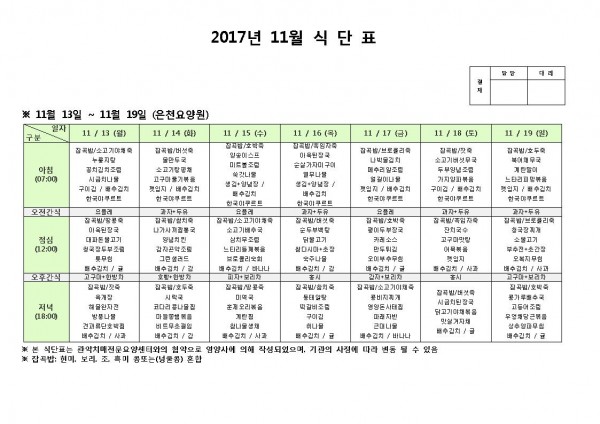 11월 셋째주 식단표 페이지 정보 작성자 은천노인복지회 작성일17-11-13 17:29 조회178,849회 댓글0건 관련링크 이전글 다음글 목록 답변 본문 11월 셋째주 식단표 이전글 다음글 목록 답변