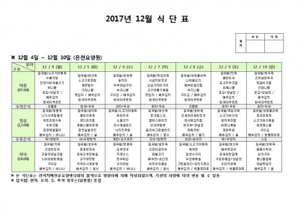 12월 둘째주 식단표 페이지 정보 작성자 은천노인복지회 작성일17-12-04 13:47 조회181,702회 댓글0건 관련링크 이전글 다음글 목록 답변 본문 12월 둘째주 식단표 이전글 다음글 목록 답변