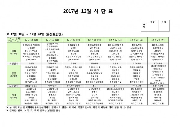 12월 넷째주 식단표 페이지 정보 작성자 은천노인복지회 작성일17-12-18 16:58 조회183,946회 댓글0건 관련링크 이전글 다음글 목록 답변 본문 12월 넷째주 식단표 이전글 다음글 목록 답변