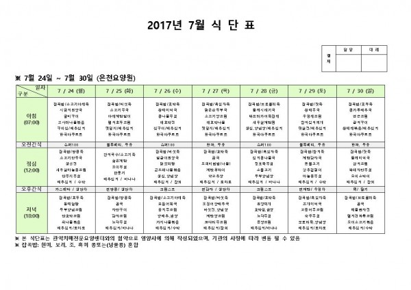 7월 넷째주 식단표 페이지 정보 작성자 은천노인복지회 작성일17-07-24 17:56 조회173,782회 댓글0건 관련링크 이전글 다음글 목록 답변 본문 7월 넷째주 식단표 이전글 다음글 목록 답변