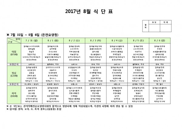8월 첫째주 식단표 페이지 정보 작성자 은천노인복지회 작성일17-08-01 13:43 조회174,493회 댓글0건 관련링크 이전글 다음글 목록 답변 본문 8월 첫째주 식단표 이전글 다음글 목록 답변
