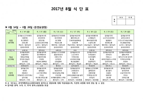 8월 셋째주 식단표 페이지 정보 작성자 은천노인복지회 작성일17-08-14 14:05 조회173,898회 댓글0건 관련링크 이전글 다음글 목록 답변 본문 8월 셋째주 식단표 이전글 다음글 목록 답변