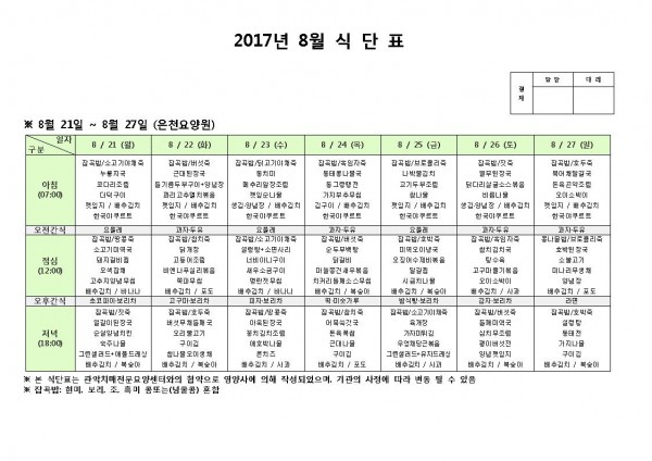 8월 넷째주 식단표 페이지 정보 작성자 은천노인복지회 작성일17-08-21 10:51 조회174,049회 댓글0건 관련링크 이전글 다음글 목록 답변 본문 8월 넷째주 식단표 이전글 다음글 목록 답변