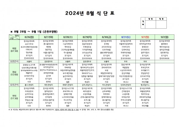 8월 다섯째주 식단표 페이지 정보 작성자 은천노인복지회 작성일24-08-23 11:34 조회16,383회 댓글0건 관련링크 이전글 다음글 목록 답변 본문 . 이전글 다음글 목록 답변