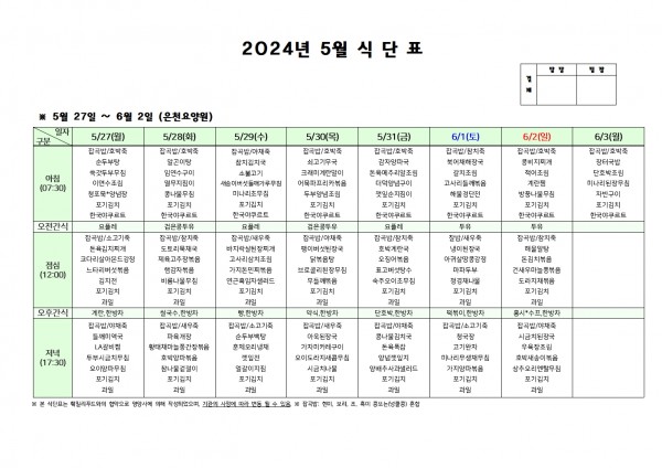 5월 다섯째주 식단표 페이지 정보 작성자 은천노인복지회 작성일24-05-24 16:18 조회19,844회 댓글0건 관련링크 이전글 다음글 목록 답변 본문 . 이전글 다음글 목록 답변