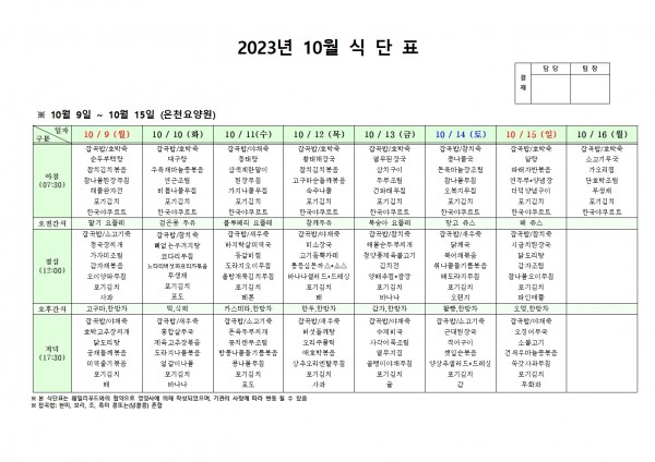 10월 둘째주 식단표 페이지 정보 작성자 은천노인복지회 작성일23-10-05 17:41 조회31,292회 댓글0건 관련링크 이전글 다음글 목록 답변 본문 . 이전글 다음글 목록 답변
