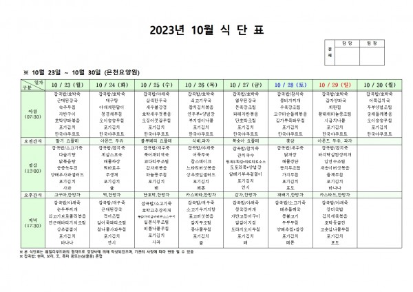 10월 넷째주 식단표 페이지 정보 작성자 은천노인복지회 작성일23-10-19 16:41 조회31,281회 댓글0건 관련링크 이전글 다음글 목록 답변 본문 . 이전글 다음글 목록 답변