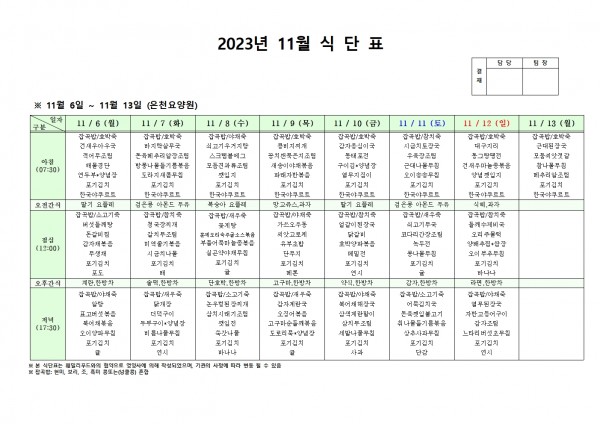 11월 둘째주 식단표 페이지 정보 작성자 은천노인복지회 작성일23-11-02 17:19 조회30,707회 댓글0건 관련링크 이전글 다음글 목록 답변 본문 . 이전글 다음글 목록 답변