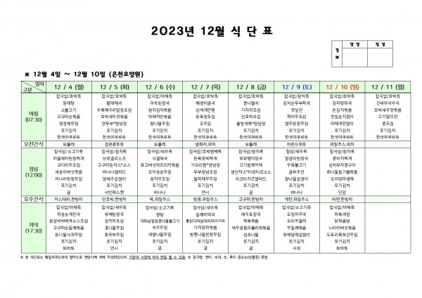 12월 둘째주 식단표 페이지 정보 작성자 은천노인복지회 작성일23-12-01 16:35 조회26,836회 댓글0건 관련링크 이전글 다음글 목록 답변 본문 . 이전글 다음글 목록 답변