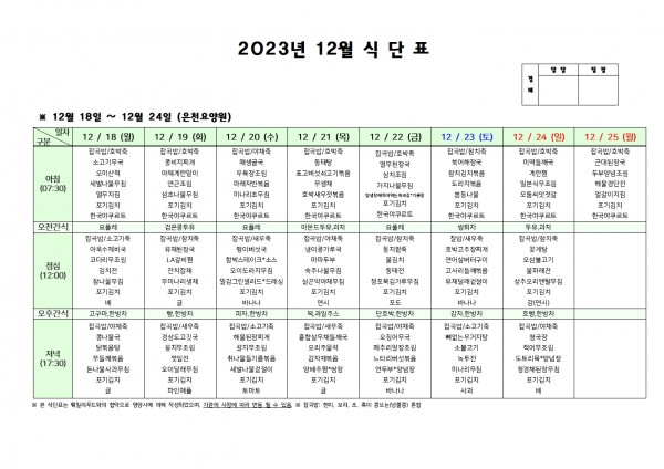 12월 넷째주 식단표 페이지 정보 작성자 은천노인복지회 작성일23-12-15 11:21 조회28,639회 댓글0건 관련링크 이전글 다음글 목록 답변 본문 . 이전글 다음글 목록 답변