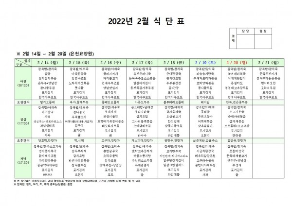 2월 셋째주 식단표 페이지 정보 작성자 은천노인복지회 작성일22-02-10 16:28 조회110,860회 댓글0건 관련링크 이전글 다음글 목록 답변 본문 . 이전글 다음글 목록 답변