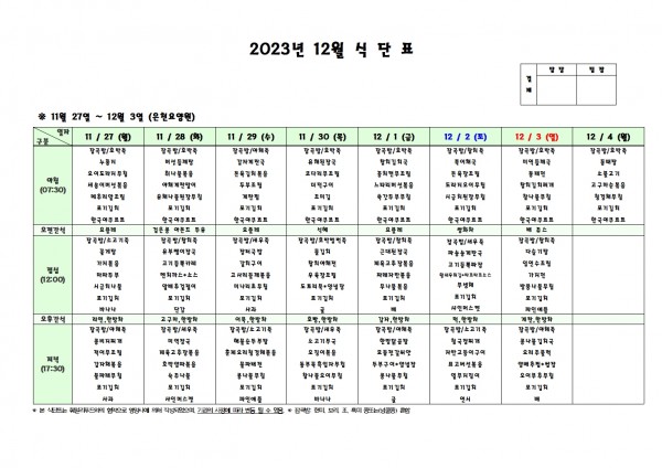 12월 첫째주 식단표 페이지 정보 작성자 은천노인복지회 작성일23-11-24 09:37 조회28,485회 댓글0건 관련링크 이전글 다음글 목록 답변 본문 . 이전글 다음글 목록 답변