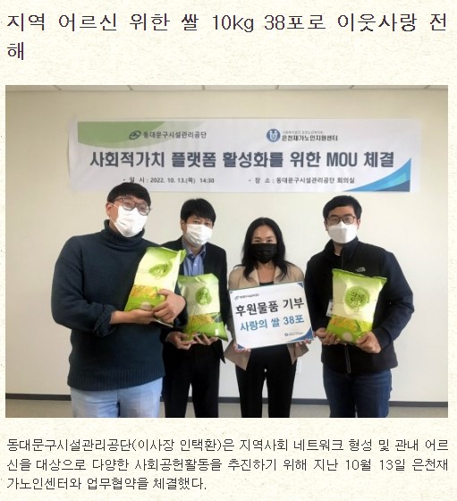 은천재가노인지원센터와 시설관리공단의 협약체결 페이지 정보 작성자 은천노인복지회 작성일22-11-09 16:58 조회7,969회 댓글0건 관련링크 https://blog.naver.com/news500/222901633880 4329회 연결 목록 답변 본문 동대문시설관리공단과 은천재가노인지원센터와 협약을 체결하였습니다앞으로 상호 협조하여 어르신의 행복한 노후를 위하여 계속 노력하겠습니다. 목록 답변