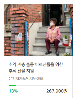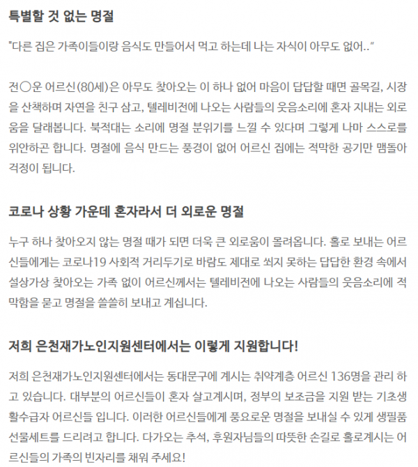 취약계층 어르신을 위한 추석선물 모금활동 페이지 정보 작성자 은천노인복지회 작성일21-08-23 10:22 조회28,350회 댓글0건 관련링크 https://happybean.naver.com/donations/H000000178857 21349회 연결 목록 본문 취약계층 어르신의 추석선물 지원을 위해 해피빈에서 모금활동을 하고 있습니다~ 모금활동에 많은 동참을 부탁드립니다~ 목록