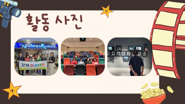 [서울시동대문구재가노인복지기관] 5월 문화체험활동 '영화관람' 페이지 정보 작성자 은천노인복지회 작성일25-06-11 14:39 조회1,666회 댓글0건 관련링크 이전글 다음글 목록 답변 본문 촬영소 사거리에 위치한 '답십리영화미디어아트센터'에서 영화 관람을 진행하였습니다! 이전글 다음글 목록 답변