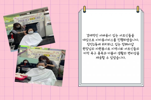 [재가노인지원서비스] 이미용 서비스 페이지 정보 작성자 은천노인복지회 작성일22-03-30 14:02 조회17,020회 댓글0건 관련링크 이전글 다음글 목록 답변 본문 3월 이미용 서비스 이전글 다음글 목록 답변