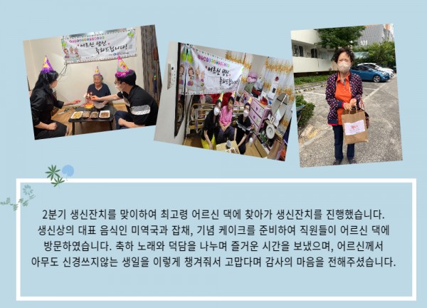 [재가노인지원서비스] 2분기 찾아가는 생신잔치 페이지 정보 작성자 은천노인복지회 작성일22-07-06 13:26 조회16,422회 댓글0건 관련링크 이전글 다음글 목록 답변 본문 2분기 찾아가는 생신잔치 이전글 다음글 목록 답변
